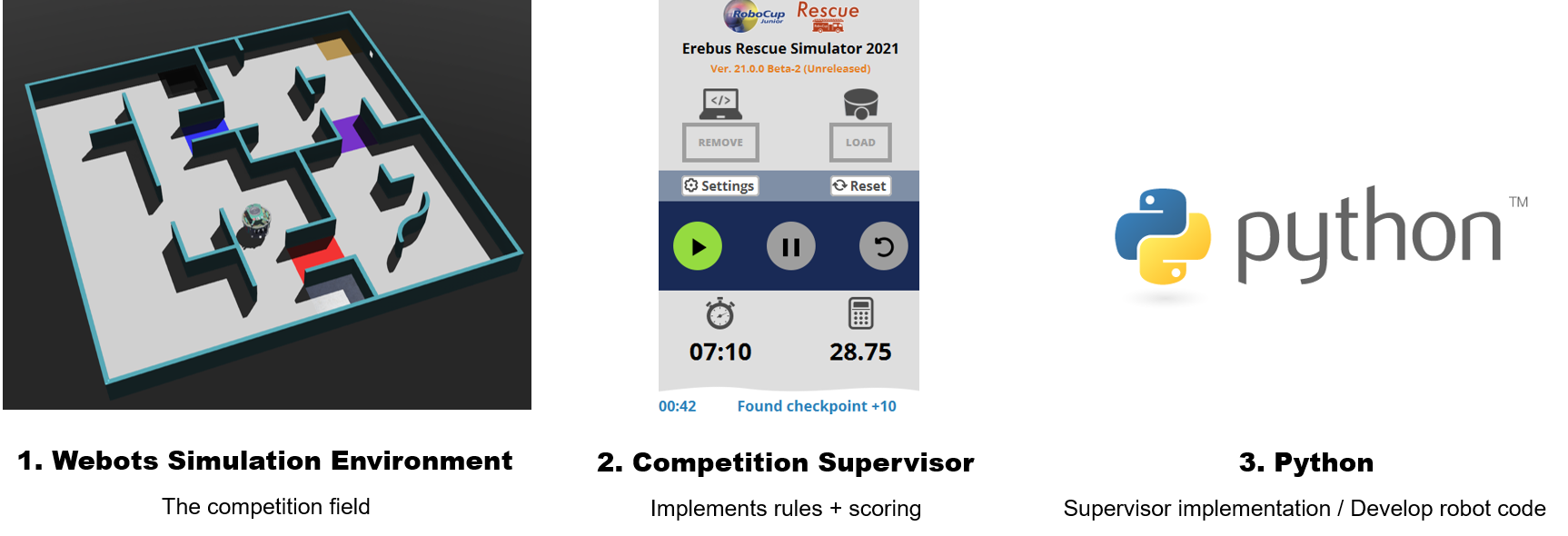 There are key components which make up the simulation system. These must each be installed. Although installation is easy, the download and install of webots can take a little bit of time! The three components are: