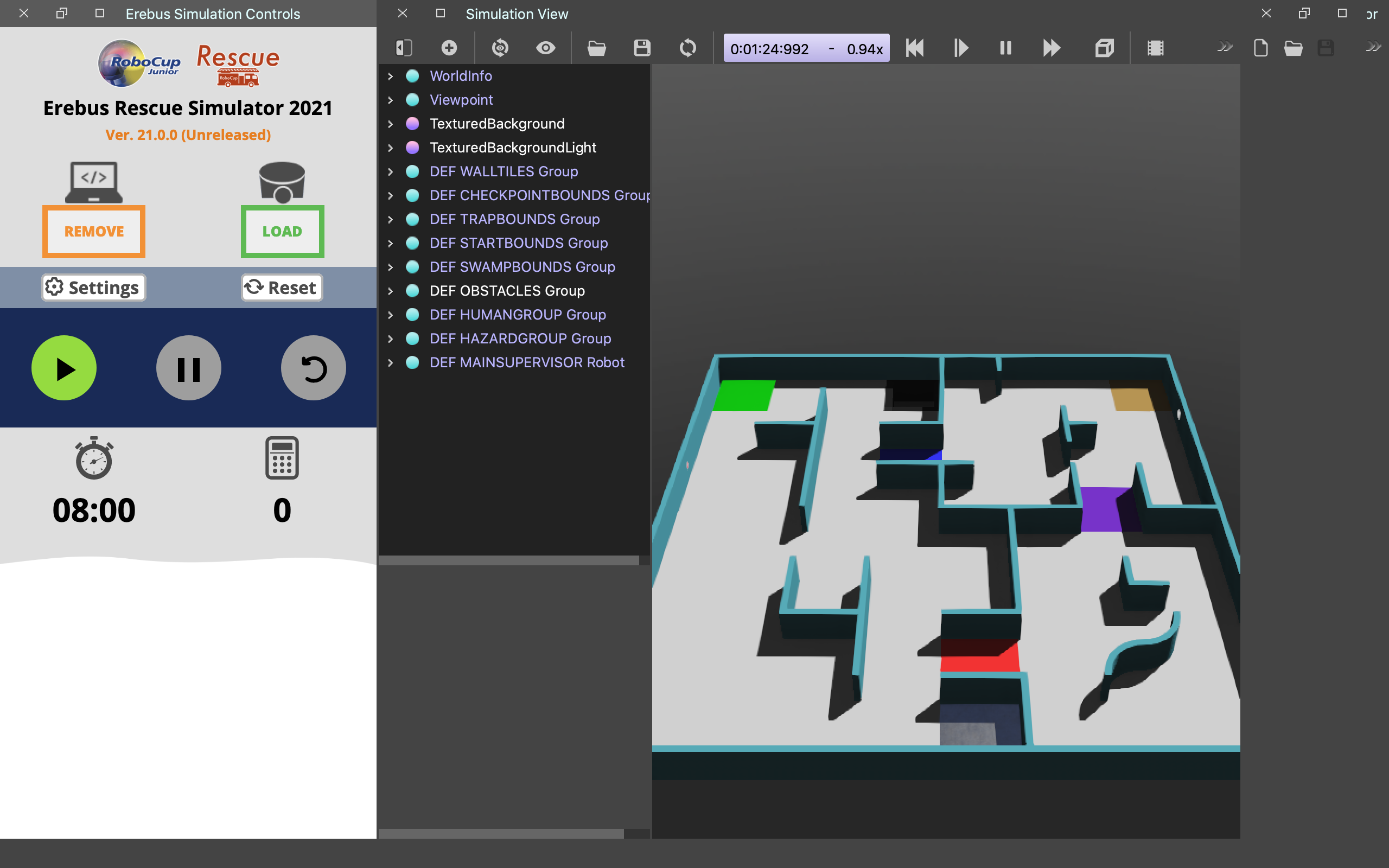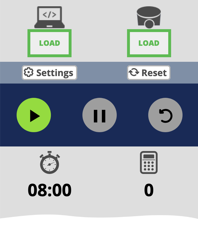 The interface to control the simulation is shown below. The top band is for loading the robot controller and a custom robot if you do make one (see here for more info). Two bands below, the three circular buttons is what you will use to interact with the simulation once the robot is moving. Below that, the remaining time and the current score is displayed.