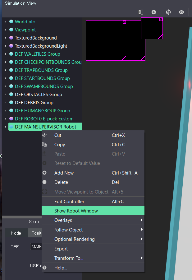 - Find “DEF MAINSUPERVISOR Robot” in the Scene Tree and right-click it. Click on “Show Robot Window”.